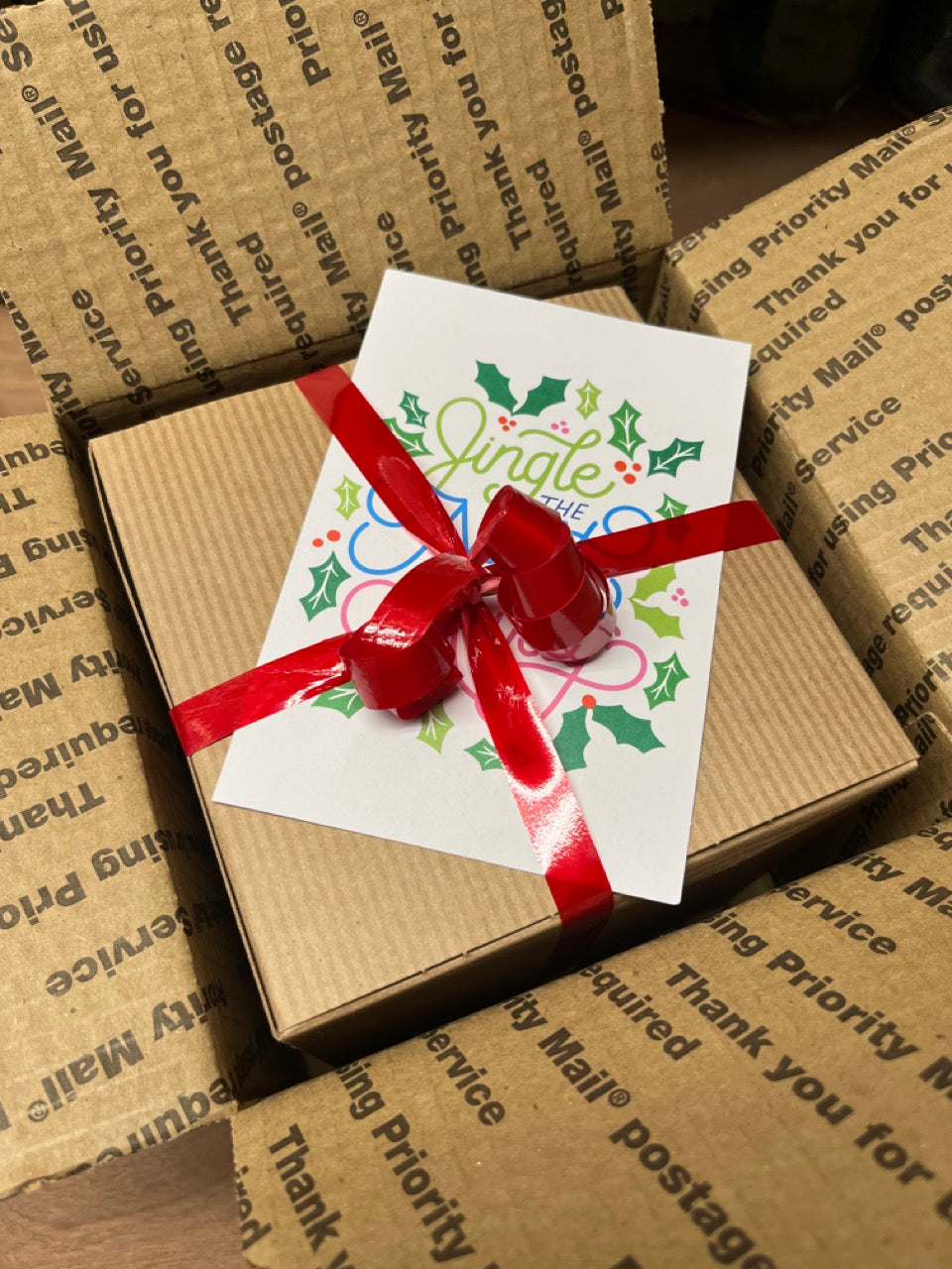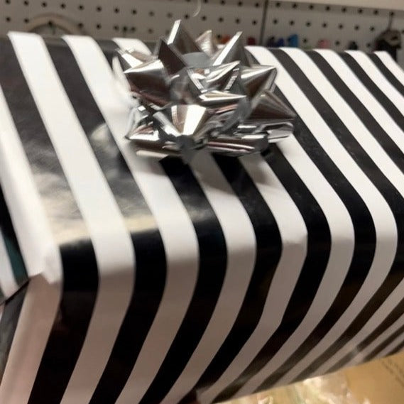 Depending on size, your pottery will be wrapped in a neutral black and white paper (pattern may vary) or be placed in white or striped kraft box for shipping. A festive ribbon or bow will be added, and a note if you wish. (cards will vary but be non-denominational)