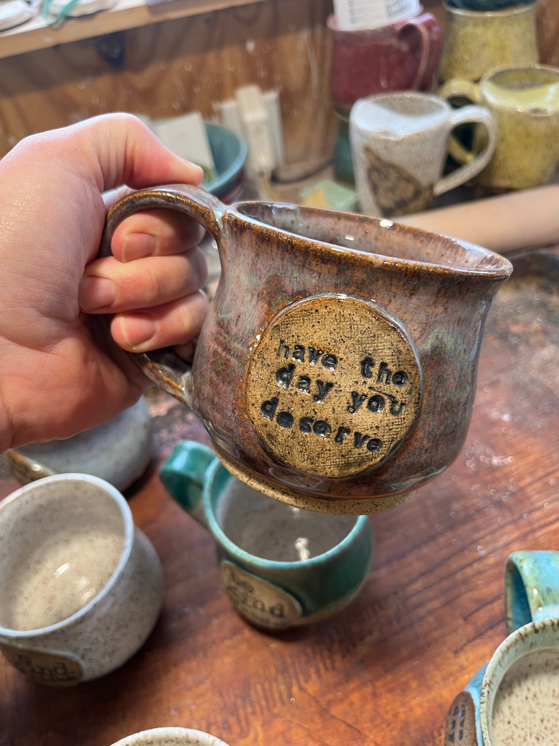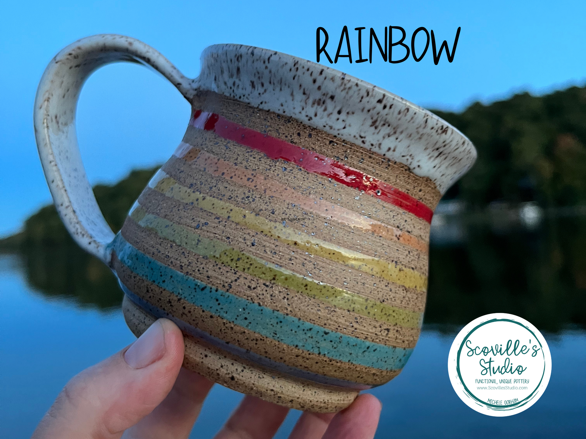 These mugs were created with the serious coffee & tea drinker in mind. The shape and size allow for mug huggers and the sturdy handle allows for mug holders. My mugs are also stackable! Perfect for storing in the cupboard or on your coffee bar.